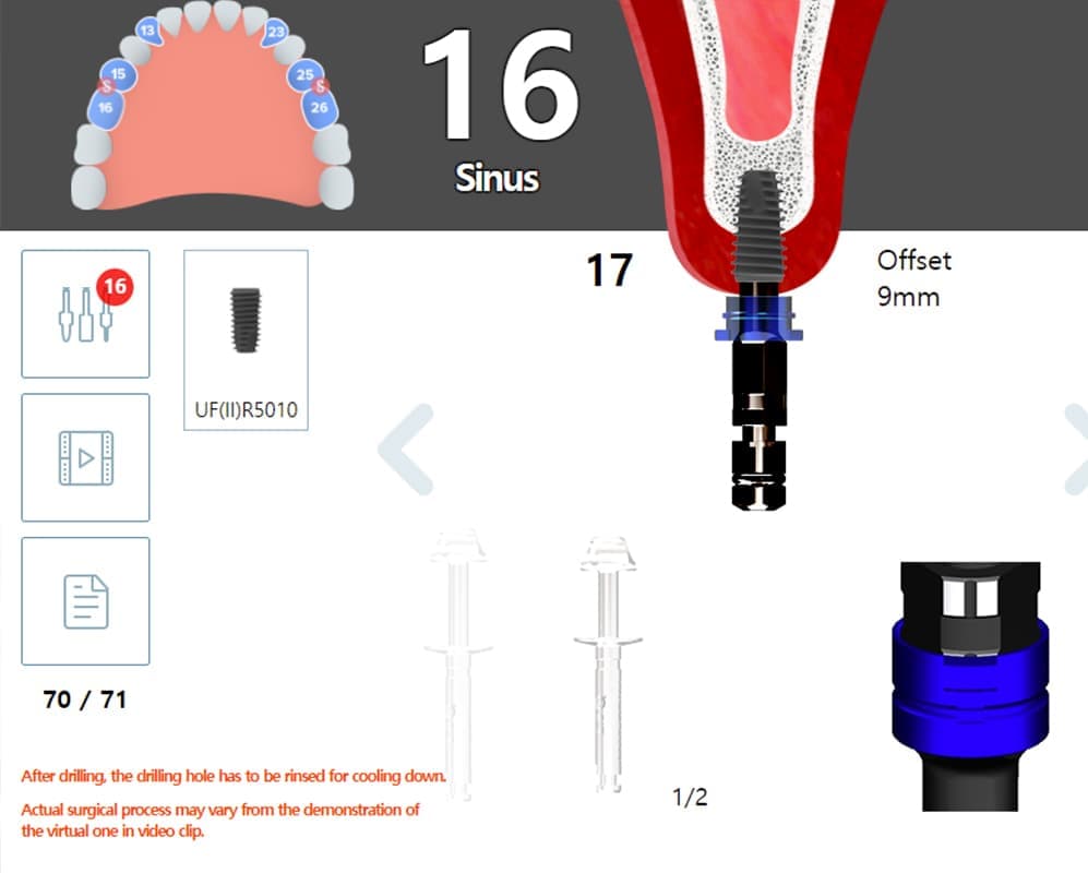 このサージカルガイドを用いて手術を行うことにより、事前にデジタル診断されたインプラントの埋入位置や角度通りの高精度で精密なインプラント治療を行うことが可能となります。